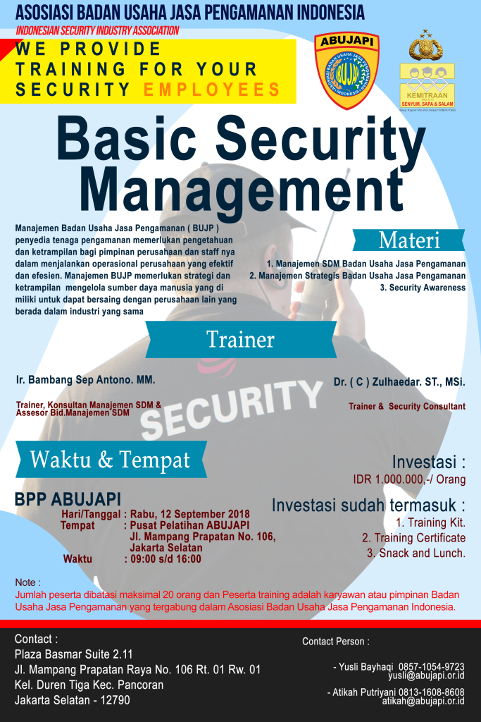 Sehubungan dengan program peningkatan professionalitas Badan Usaha JasaPengamanan yang menjadi Anggota Asosiasi Badan Usaha Jasa Pengamanan Indonesia ( ABUJAPI ). BPP ABUJAPI akan melaksanakan kegiatan Training BASIC SECURITY MANAGEMENT pada tanggal 12 September 2018 bertempat di Sekretariat BPP ABUJAPI dengan maksimal peserta 20 orang per angkatan. Adapun informasi lengkap terlampir.
