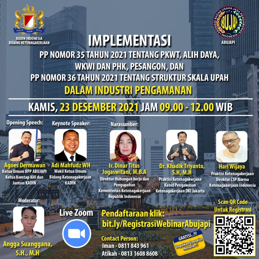 Dengan ini kami mengundang Bapak/Ibu/Saudara/i untuk hadir pada kegiatan secara virtual Zoom dengan tema IMPLEMENTASI PP NOMOR 35 TAHUN 2021 TENTANG PKWT, ALIHDAYA, WKWI DAN PHK, PESANGON dan PP NOMOR 36 TAHUN 2021 TENTANG STRUKTUR SKALA UPAH dalam INDUSTRI PENGAMANAN yang akan dilaksanakan pada :